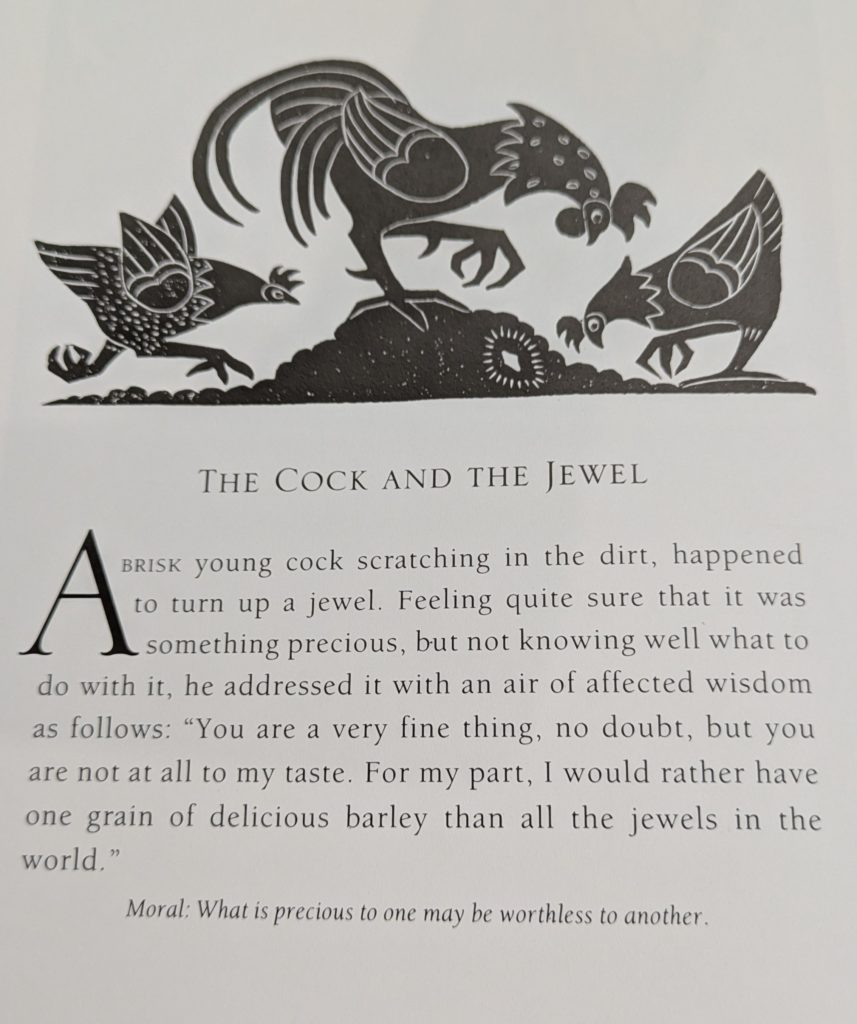 元気いつぱいの若い雄鶏が汚泥をかきだしてゐると、おゝ、宝石を掘り出した。これは値打もんだなとはわかつたが、じぶんには扱ひかねたので、箴言めかして似合はぬことを口にした。「おまへは一級品だ。まちがいなくな。しかし、おまへは私の趣味にかなはぬのだ。おれさまとしてはだな、世界中の宝石をあつめて目の前にどうぞと突き出されるより、ひと粒でいゝから、美味なる大麦を喰へたほうが、余程好ましいのだ」
