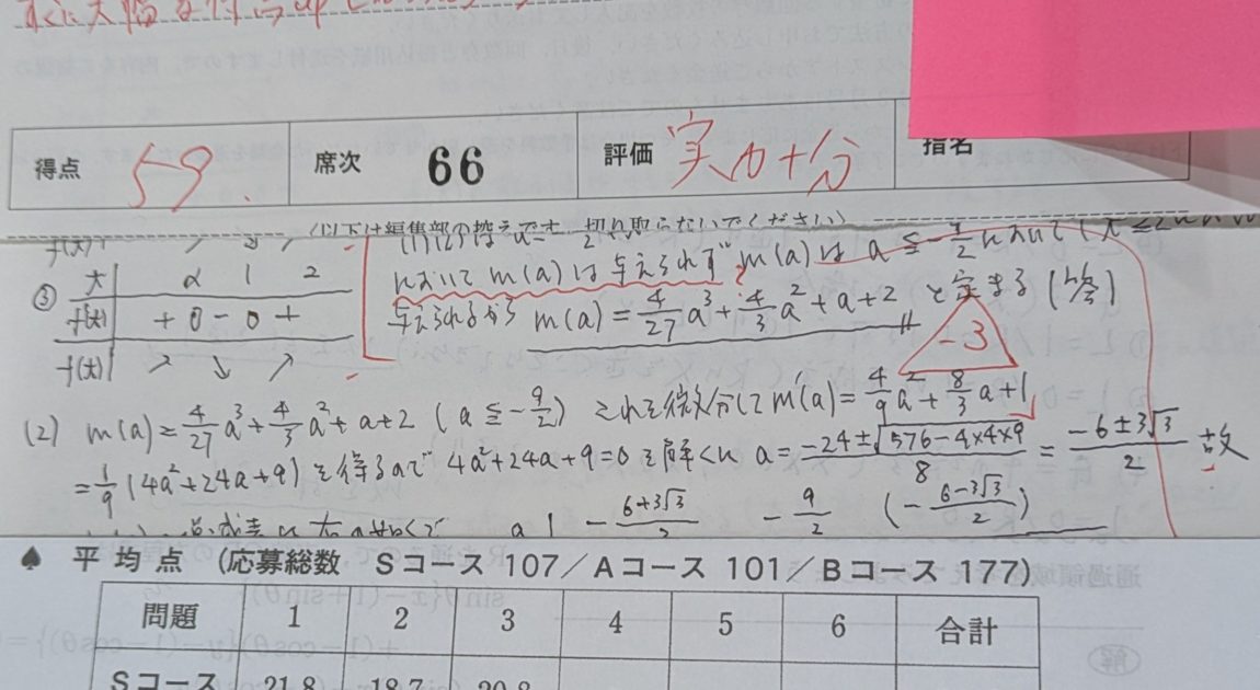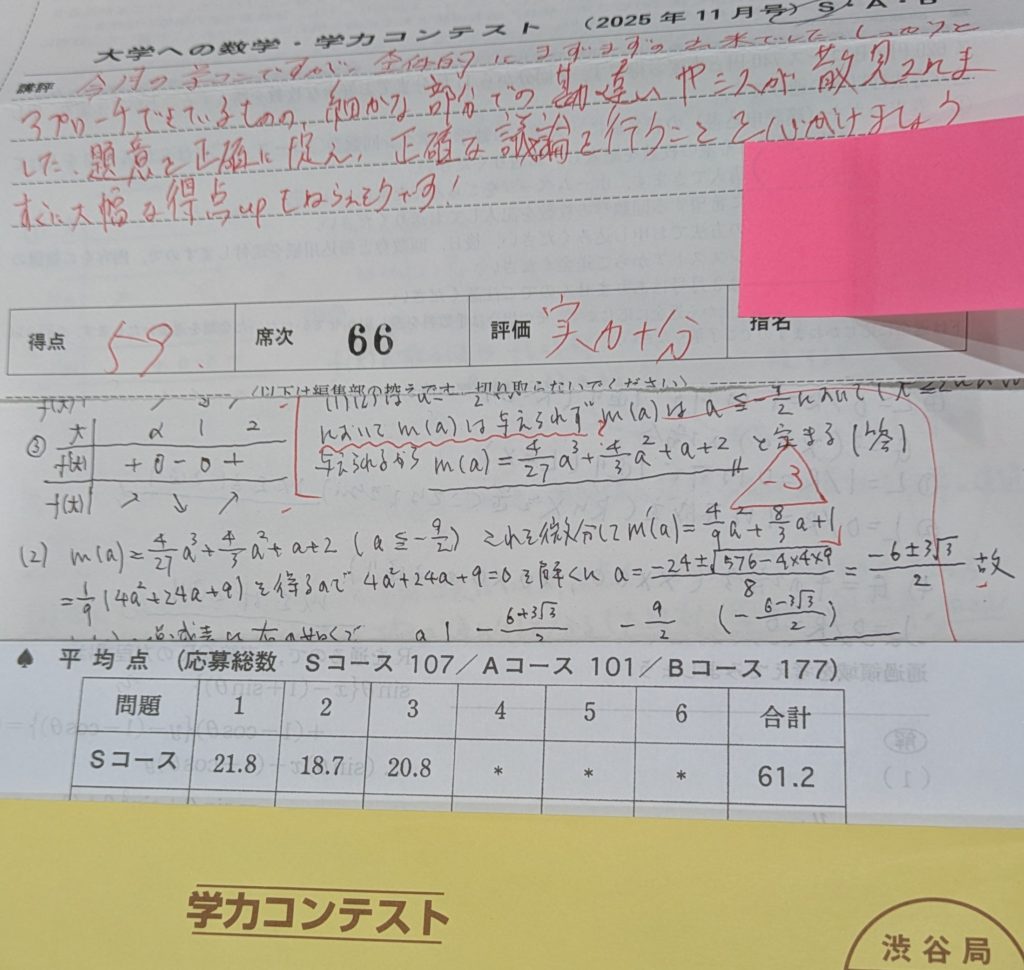 今日は『大学への数学』の学力コンテストの結果が返つて来る日だな、といふ楽しみがこの齢になつても、あるといふのは幸せの一種かなと喜んでゐたのも束の間、開封すると、てつきり満点と思つてゐた結果が何と、59/75点。