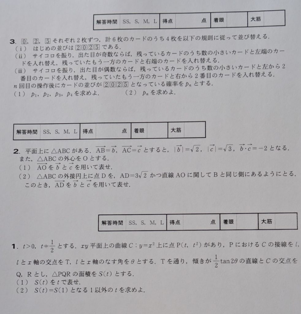 1番がいちばんかんたん。直線の傾きに関してtanの加法定理をつかつて解くといふのは、大昔(1980年代)、東大の文科で出題され、三角関数の加法定理などは「高度」過ぎて不慣れな当時の文科受験生はパニックを起こし、総崩れになつたといふのが有名な話。いまは出題されてトーゼンの問題になつてゐます。三角形の面積をどう求めるかゞ腕の見せ所なのでせう。3つ解法があるやうですが、私は愚直に底辺×高さ÷2で求めました。