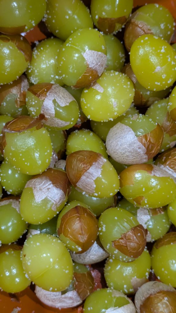 銀杏ぎんなんといへば、銀杏いちょう並木の東大を思ひ出すといえば、嫌みだが、それはウソである。わたくしは殆ど大学に通はなかつたから、思ひ出したくても、思ひ出さない。但し、本郷がこの時期、臭かつたのは憶へてゐる。中火位で15分も炙あぶれば、だいたい中に熱が通つてゐる。殻割で一つひとつ割つていく。うすみどりに綺麗に透き通つた粒がでてくるのを器に集めていく。根気の要る作業である。ぜんぶ剝き終つたら、藻塩をぜんたいに振つて薄くまぶす。うすはりのグラスにそゝいで、キンキンに冷えた麦酒のアテに、暖かみの残る、ぬくい銀杏を噛みしめ噛みしめ、いたゞくのは、幸福に似たものである。