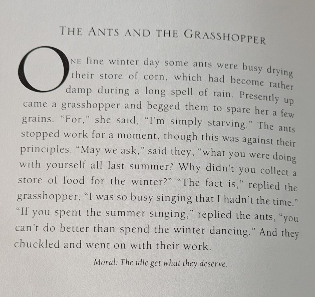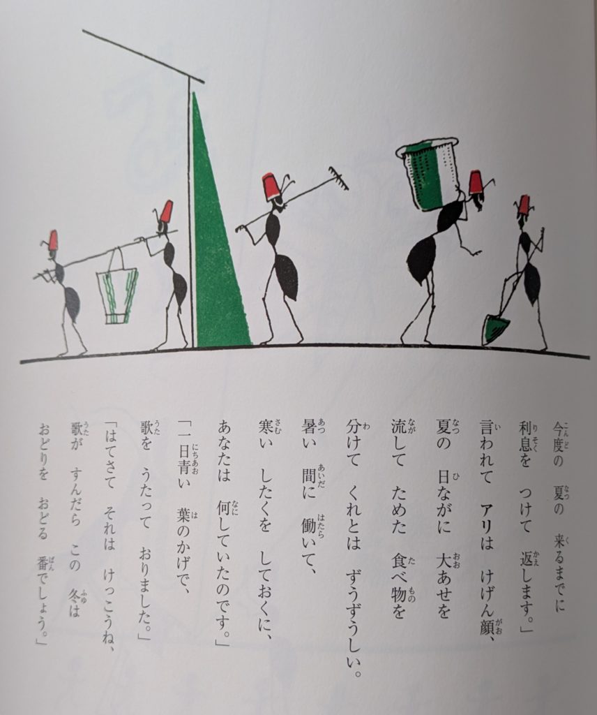 蟻たちはキリギリスの言ひ分に答へてかう言ひました。「夏を歌つて過ごしたと言ふのかい。それぢや冬には踊るが一番さね」。蟻たちはくすくすわらひ、仕事をつゞけましたとさ。