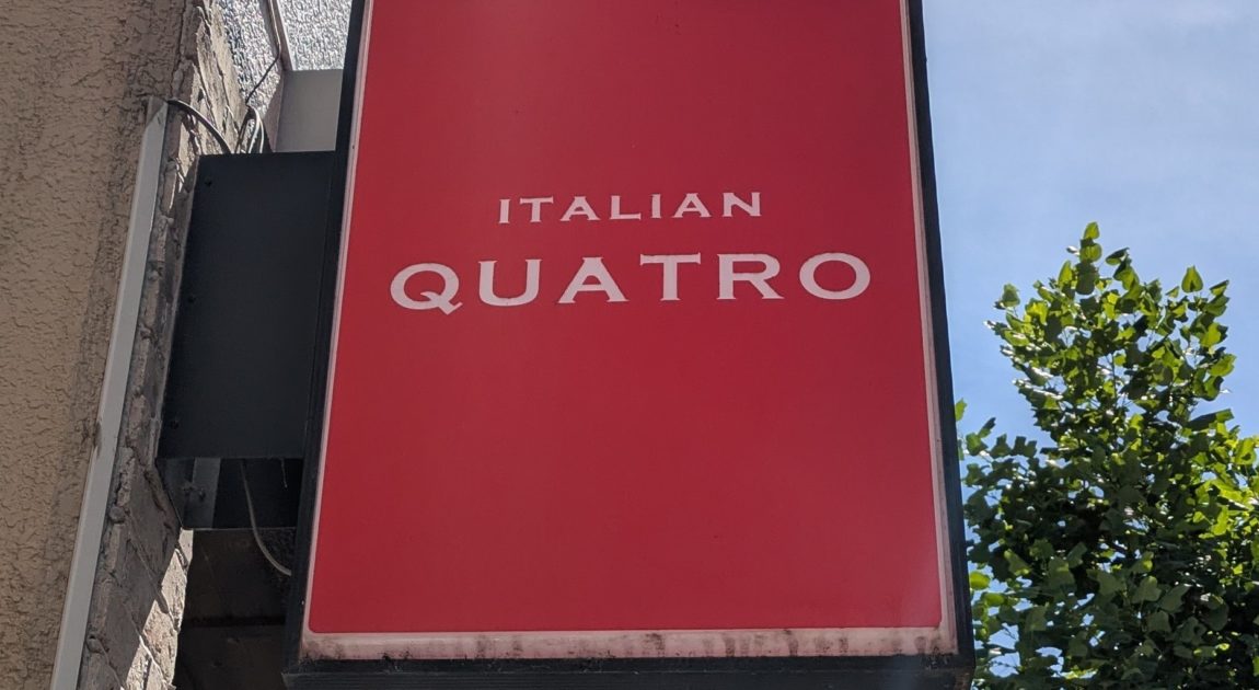 昼飯の「定番」を外れた私はふらり、烏丸通にながれていつた。おもへば、ここで商売をはじめて、8年も過ぎた。8年もだぞ! あゝと詠嘆の吐息をついてよい権利くらゐ、私にもあつていゝだらう。しかし、ふと見上げたイタリアンのお店QUATRO(なんでもカルテットとか、数字の4に関はる言葉だらう)をみて、こゝに入らうと思つたことは、たゞの一度もなかつたのである。店がまへからして、私とは、tasteがちがふと思つたせゐだらうが、せつかく「定番」を外して烏丸通に来たのである。勇を鼓してドアを押してみたら、存外空いてゐて、すゞしく、定食付のサラダも適当ではなくておいしく、スパゲッティもイケた。